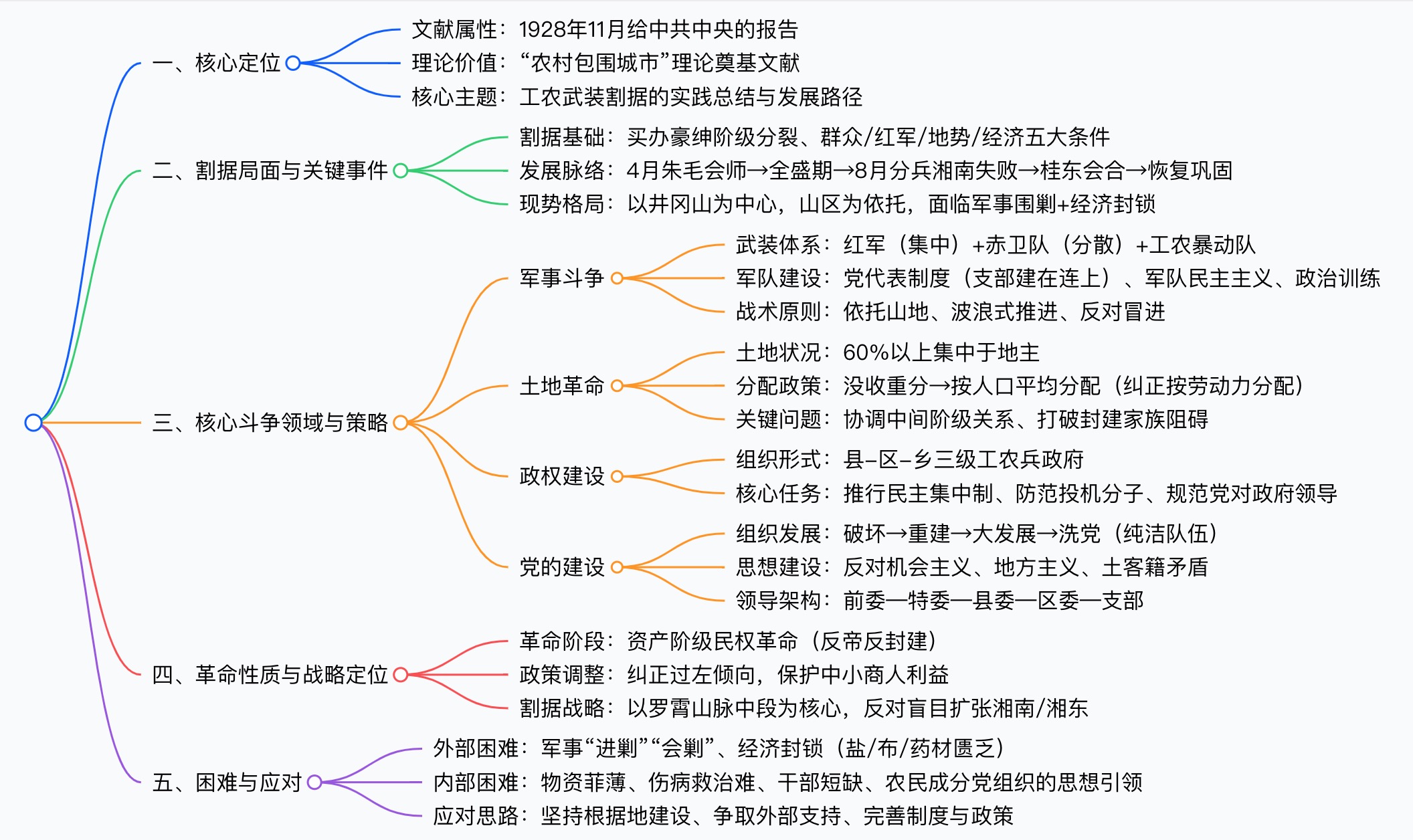 本文是毛泽东于1928年11月25日写给中共中央的报告,系统总结了井冈山革命根据地一年来的斗争经验。报告详细阐述了武装割据、党的建设、军队建设、土地革命、政权建设等重大问题,是"工农武装割据"思想的重要发展,为中国革命道路的形成提供了实践基础和理论依据。当时根据地正面临严峻的军事"会剿"和经济封锁,党内也存在分歧和错误倾向,毛泽东的报告回答了红色政权如何生存发展这一根本问题。
